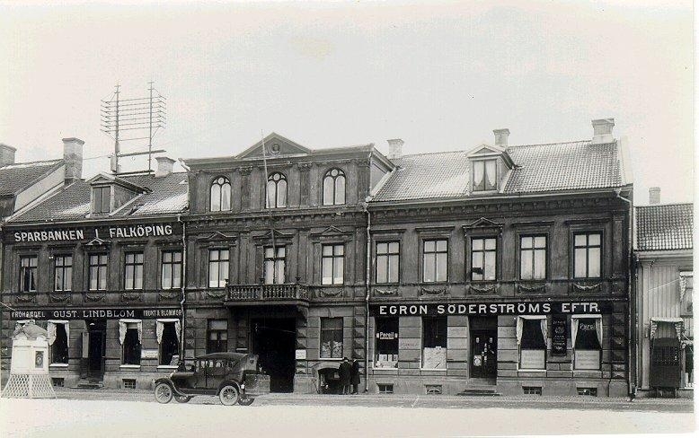 Stora torget. I Hallénska huset har både Sparbanken och Telegrafen varit inrymda. Grunden till Hallénska lades 1878. Obs. bilen framför byggnaden.