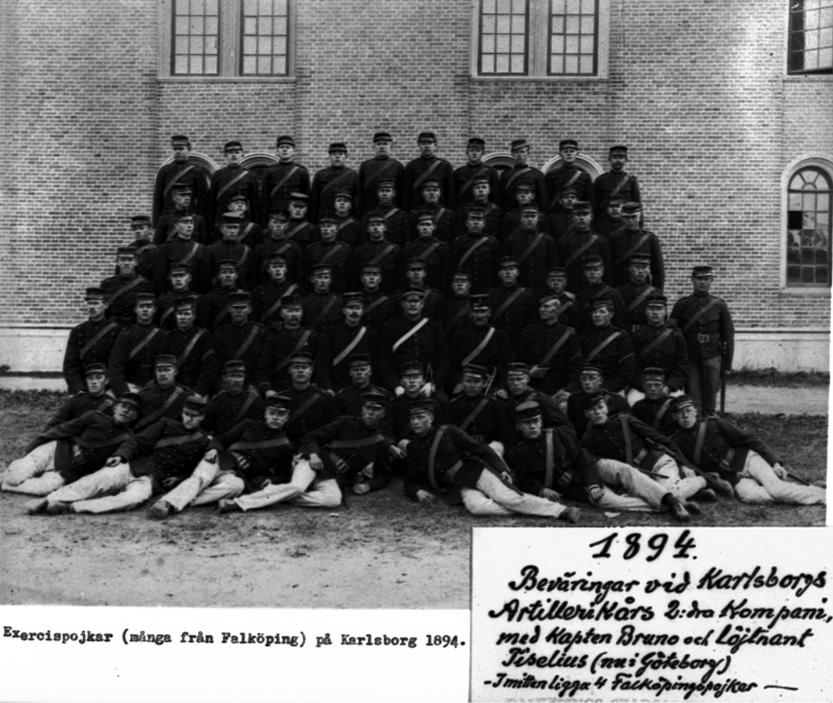 Beväringar vid Karlsborgs artillerikårs 2:dra kompani, med kapten Bruno och löjtnant Tiselius (nu i Göteborg) i mitten ligger 4 falköpingspojkar.