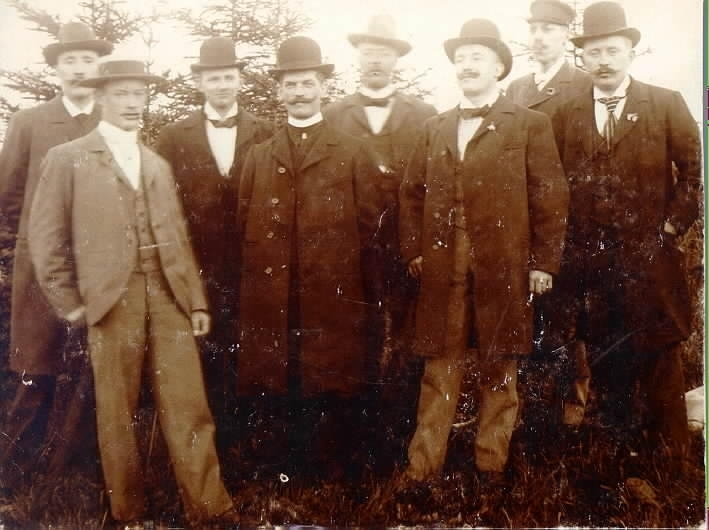 Åtta stycken av stadens ungherrar vid sekelskiftet 1900. Fr.v. järn- och specerihandl. Axel Spets, spannmålsbokhållare Malcolm Westerling, bokbindare Mårten Lindgren, lagerbokhållare Arvid Jacobson, godsägaren Leopold Warodell, Wilhelmsro, barberaren Lauritz Kappers, manufakturbiträdet Harald Kilander, handl. (speceri) Gustaf Andersson "Stekis".