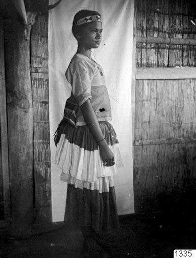 Adlig flicka i blå och vit kjol med huvudband av pärlor. W. Kaudern: I Celebes obygder. Stockholm 1921. Del I. Bild 88. Bildark: 10768. Neg. nr: 6133.