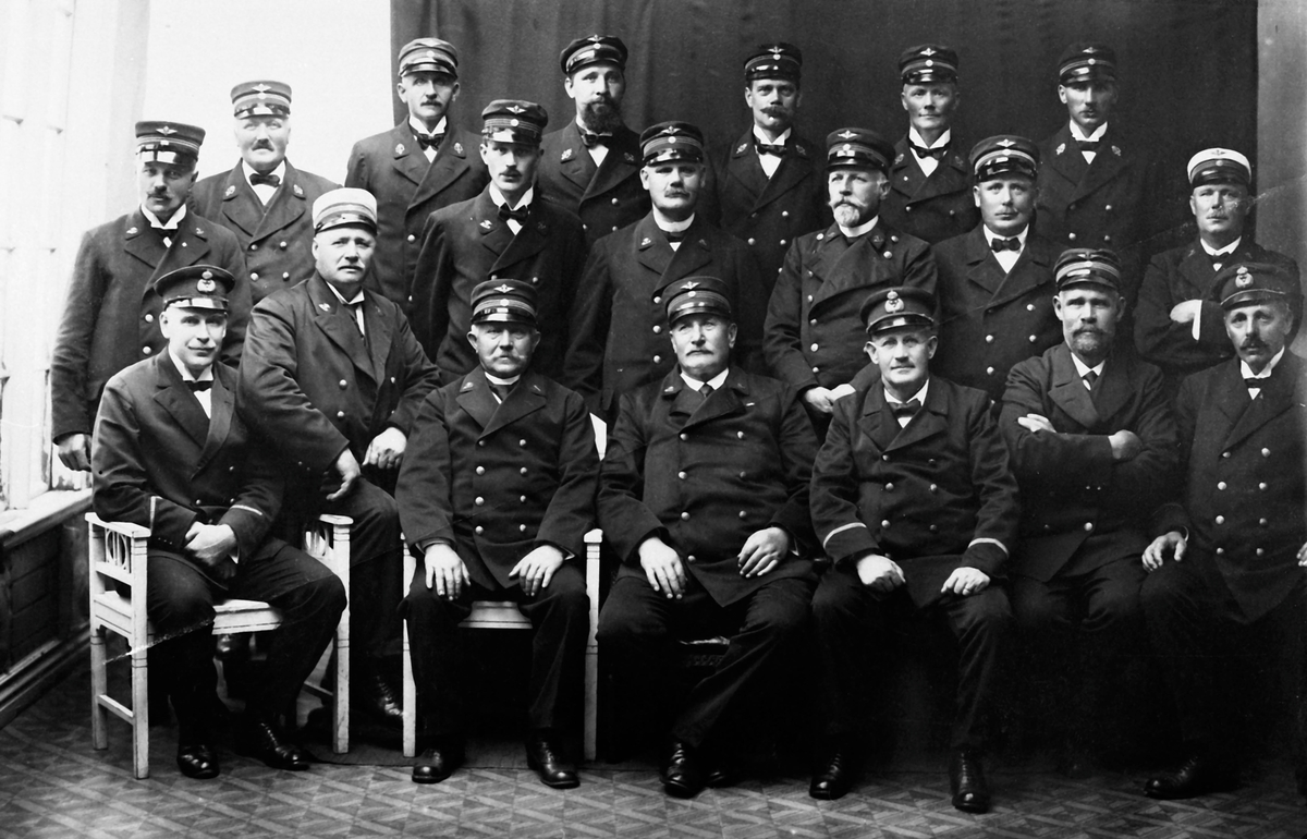 Järnvägen. Banmästarmöte i Falköping omkr. 1925. 1:a raden: Överbanmästare Martin Olsson, 2. Åstrand, Habo, 3. Lundblad, Stenstorp, 4. Axel Mörk, 6. Kjellberg, Falköping. 2:a rad. 5. Charles Mörk. 3:e rad. 2.bvfm Broman, Jönköping, 4. Hackberg, Falköping.