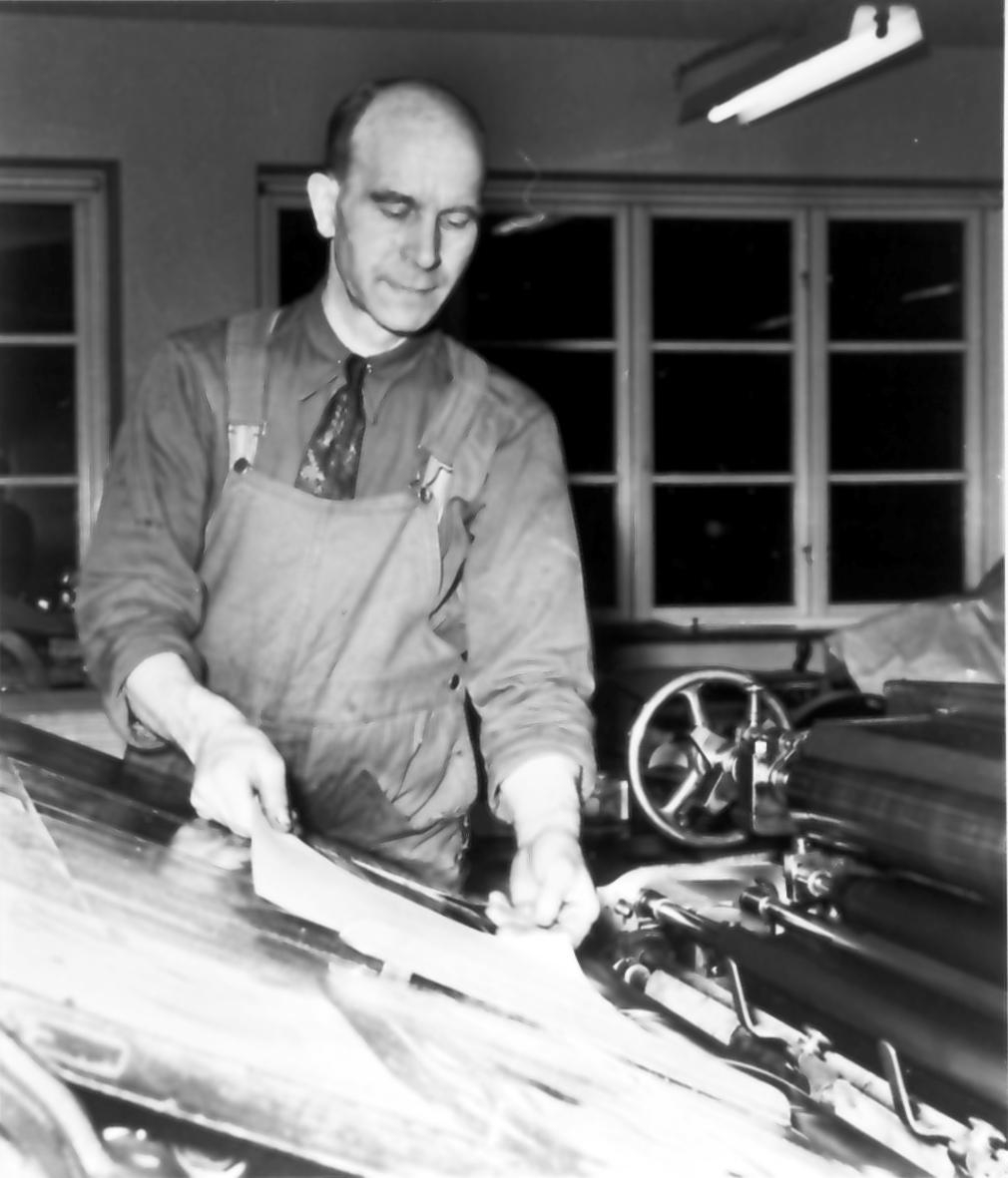 "Tryckare Evert Bergsten i arbete". (Skaraborgaren). Från utställningen "Falköping i bild" 1952. Evert född 1903 i Kälvene.