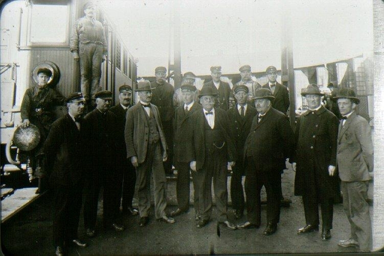 Järnvägsmän vid ett lok på bangården. 1. Gösta Hallberg ( på bufferten) son till Ernst Hallberg, Gudhemsvägen. ing. 2. Per Vallberg, lokförare 3. Reimers, lokreparatör 4. Gustavsson, stallkarl Torstenssonsgatan. 5. Axel T.Lindgren, kontorist Döbelnsgatan 7, stadsfullmäktige m.m. 6. rep. Zetterberg, 7. Erik Larsson, kontorist 8. skymd, 9. lokmästare Danielsson, son till Daniel Svensson Odensberg, 10. bakom den föregående, 11. förman Persson? 12. (bakom den föregående) Blomén, rep. Ällagatan 13. Johan Olsson (ordf. i västra kommunen) 14. lokeldare Bengtsson (Tommis), 15. okänd 16. Folke Hallberg, 17. på loket Karl Ljungqvist.