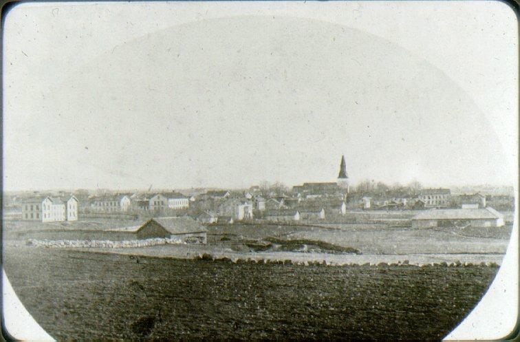 Utsikt över Falköping, taget från nordnordväst, ungefär från samskolans tomt eller från höjden vid Jungfruhålan i parken.
