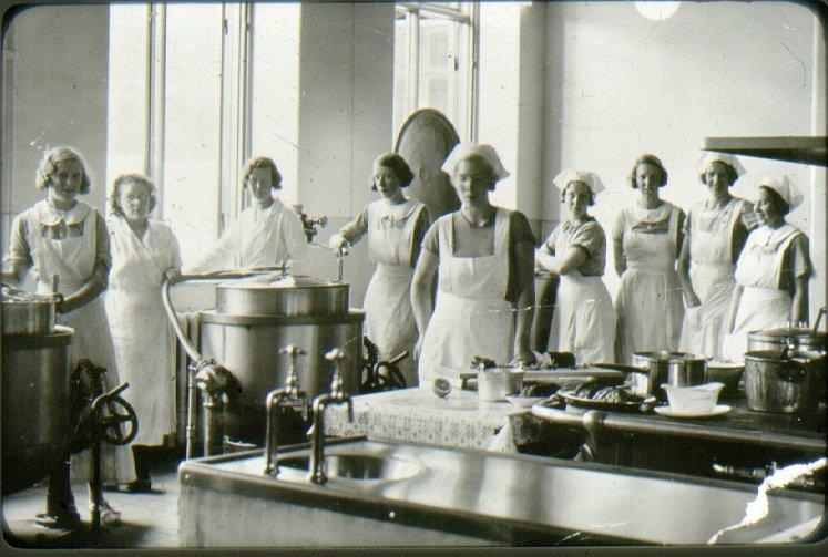 Lasarettet, köket omkring 1936-38. Fr.v: 1. Astrid Palmkvist, 2. Iréne Johansson, f. Andersson 3. fru Eriksson (föreståndare) 4. Inga Borg 5. Hildur Kilander 6. Alice gift Andersson 7. Märta Helander 8.Märta Myrberg (första kokerska) 9.Astrid Jägerfeldt.