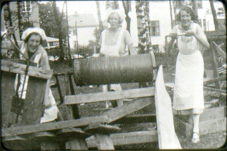 Lasarettet, kökspersonal hämtar upp vatten. Från vänster: Alice gift sedermera med "Tummen" Jönsson, Hildur Kilander, Märta Myrberg.
