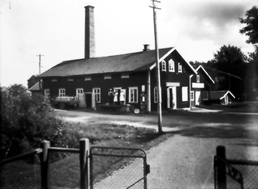 Floby mejeri. Hofflanders möbelafär och källaren. Mjölkbilen kördes av Erik Gustavsson. På trappan mejeristen Göran Johansson me fru Signe och sonen Halvard samt en mejerska.