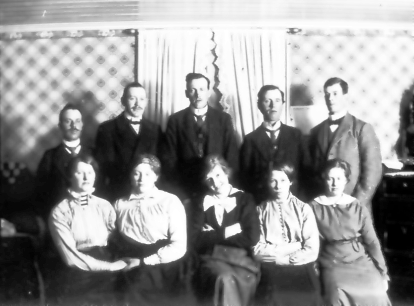 Stående Claes Andersson, Verner Gustavsson, Oskar Andersson, okänd, Torsten Fält. Sittande Berta Andersson och fyra okända.