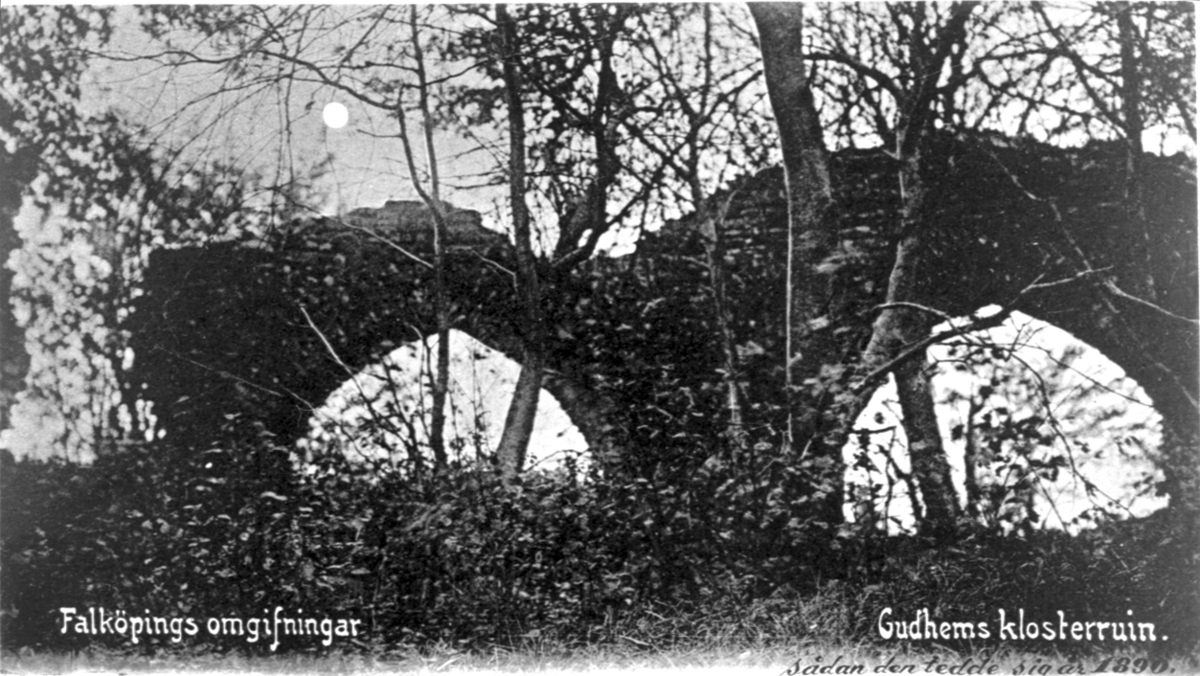 Gudhems klosterruin i dramatiskt månsken där endast valvbågarna sticker upp ur ruinkullen. 1890.