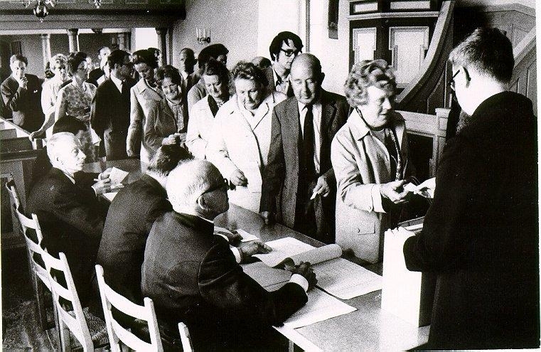 Kyrkoherdeval i Gudhem. Vid bordet sittande från höger kyrkoherde John Fägerlind , i mitten troligen Jens Torstensson, till vänster Gunnar Karlsson, Gudhem, prosten Broman tar emot röstsedlarna: 1:a fru Norlin, 2:a Göte Karlsson, 3:a hans fru, den femte fru Birgit Johansson, Hällestorp.