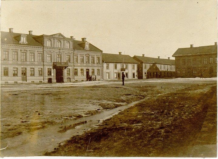 Hallénska huset. Falköpings första privata stenhus. Obs. beläggningen på StoraTorget ej påbörjad.