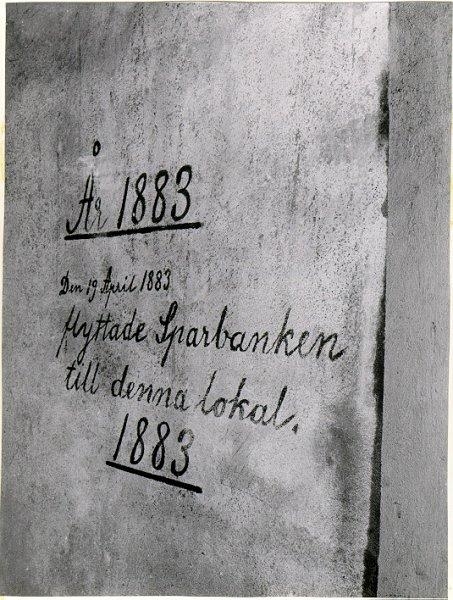 Kassavalv i Lindgrens blomsterhandels lokaler med texten "den 19 april 1883 flyttade Sparbanken till denna lokal".