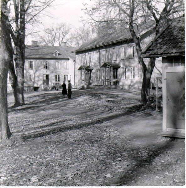 "Statens gård". Järnvägens hus (bostäder för järnvägtjänstemän). Revs omkring 1965. Åt höger Kerstia Backe (avrättningsplats)."