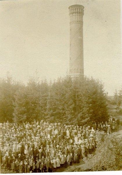 Falköpings folkskolor på utflykt till Mösseberg. Tornet uppfördes år 1902.