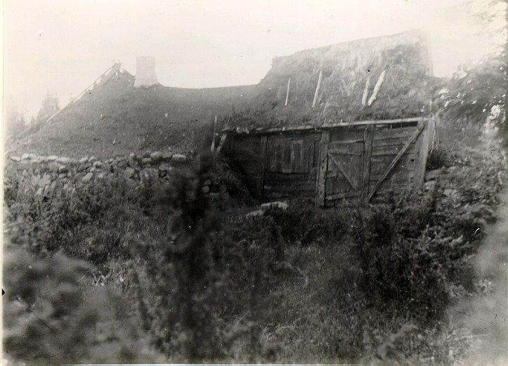 N. Åsarps socken. Kvarnaskogen."Ryggåsstôva mä brotaskjul." "Alla-Kals" stuga uppförd av sten och skifte. Ryggåsstugan från baksidan. Nu nedriven men murarna står kvar.