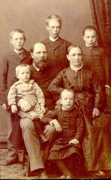 J. Wallin med hustru och barn. Längst upp på fotot sonen Pontus, död som detektivchef i Göteborg, överst t.v. sonen Harald, handl. i Torup, Halland, överst t.h. dottern Marianne, gift i Tyskland.