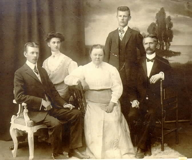 Familjen Malmsten, fr. v. Folke, Magnhild, Amanda, Erik och buntmakare Malmsten.