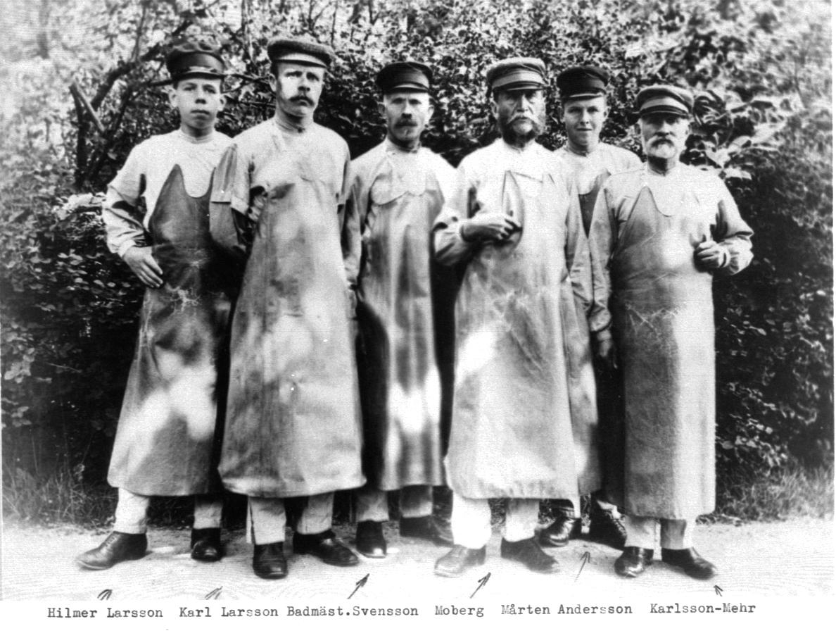 Anställda badare på Mössebergs bad. Hilmer Larsson, Karl Larsson, Badmästare 3:a fr.h. Svensson, 3:a fr.v. Moberg, Mårten Andersson, längst till höger Karlsson. (I anteckningar står det Karlsson Mehr).