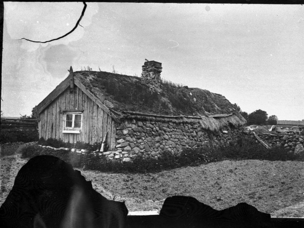 Gammal stuga, exteriör - stuga med torvtak och murad baksida av natursten. Fotot delvis skadat.