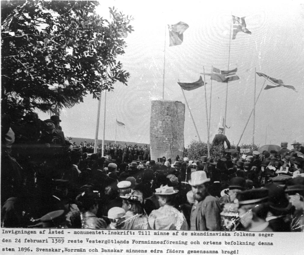 Åslemonumentet. Invigningen av Åslemonumentet. Inskrift: Till minne av de Skandinaviska folkens seger den 24 februari 1389 reste Vestergötland fornminnesförening