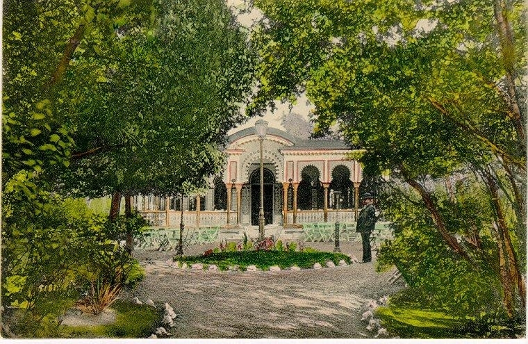 Rantens hotellträdgård, restaurangen. När byggnaden tillkom har vi ingen uppgift om - sannolikt hänger anläggningen nära ihop med stationens och Rantens hotells tillkomst. Färglagt foto.