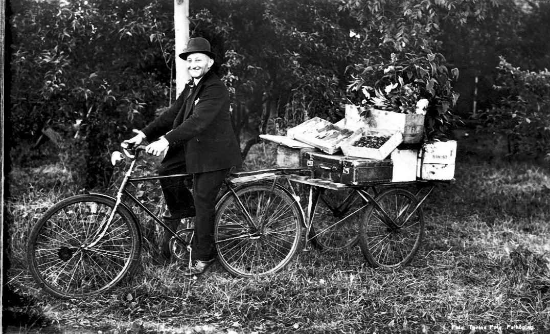 Titel: Frukt- och grönsakshandlare Albin Karlsson, Torbjörntorp på väg till torget i Falköping.