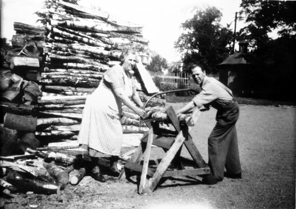 Titel: Hjalmar Eriksson med fru. Vedsågning vid skolan, nuv. lasarettstomten.