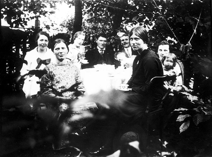 Bersån Botvidsgatan 55. Märtha Kjellberg, Anna Johansson, Nanna Kjellberg, Gustav Adolf Johansson, Richard Karlsson med Anna Lisa i knät, Karin Melin, Edla Adolfsson med Lars.