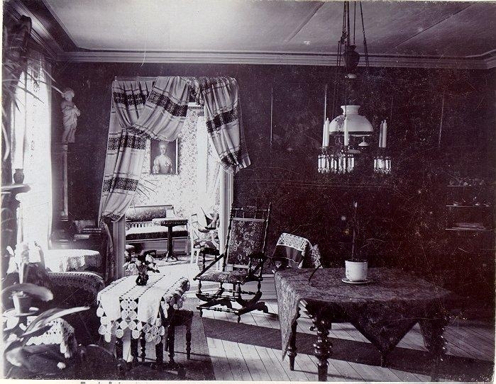 Warenbergs hem, Storgatan 20, Tyska tomten, Falköping. Förmaket sett från "salen". Taget 1902 före auktionen. Fotografen har stått framför tamburdörren. På tamburen var en balkong. Drottningtavlan hänger på ytterväggen till Ekmans gränd. Det vita broderiet bakom gungstolen hör till en stor duk som täcker taffelpianot. Detta forslades landsväg från Stockholm. - Otto Warenberg var en mycket god vissångare. Otto Warenberg född 1839 - död 1902. Helga Warenberg född 1843 - död 1899. Arvinge: Karl Alfred Warenberg född 24 Juli 1878.