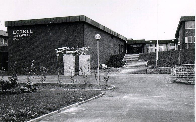 Forum Stenstorp. Hotell och biograf mellan Högalidsgatan och Järnvägsgatan. Skulpturen "De fyra vindarna".