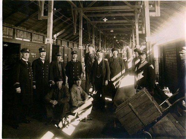 Järnvägen. Personal. Fraktgodset. Från v. stationsinspektor Johan Emil Dalhoff, stationsskrivare A. Högström, stationsförman Klas Johansson, stationskarl A.V. Eriksson, stationskarl Axel Nyström, sittande: G. Sahlkvist, A, Åkerhage, Hultgren, G. Svensson.