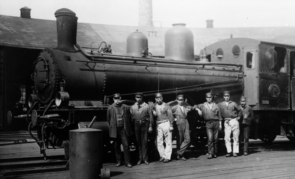 Järnvägen. Järnvägstjänstemän. Verkstadsarbetare från vänster: rep. Blomén, rep. Adolf Ruud, Haglund, Andersson, Adriansson och K. Ljungqvist.