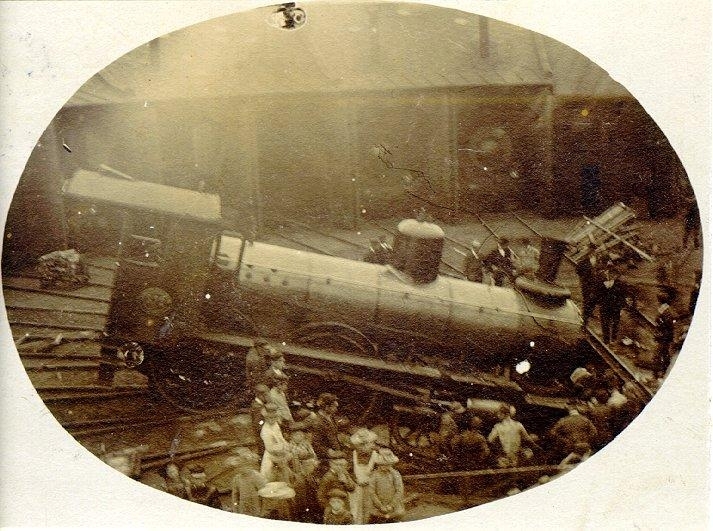 Falköping-Ranten. Bangården. Loket har gått ner i vändskivan på Falköping-Ranten 1905.