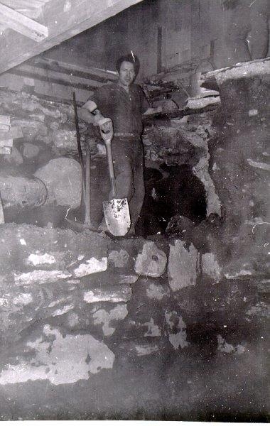 Kv. Rådmannen 2, Stora torget 19 - Storgatan 5. Grävningsarbete under Hägertz herrekupering. Korta vinkelmuren mot Stora torget. Foto och gåva av Ragnvald Andersson