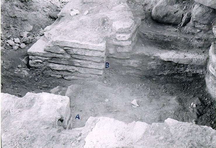 S:t Olofs kyrka. Restaureringen 1958-1961. Romanska torngrunden nedre delen av trapphuset. Foto från nordost. Romanska torngrunden. Trappan i södra muren. Vid A och B dörranslag, vid C trappspindel. Foto från väst.