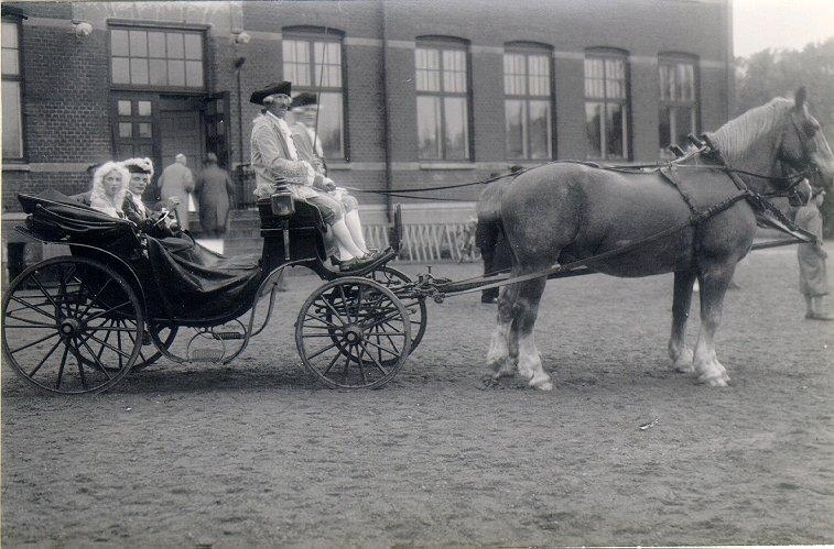 Kulturhistoriska festtåget och festspelen i Falköping den 5 augusti 1934. Greve och grevinna med kusk och betjänt, samtliga i dräkter från senare hälften av 1700-talet. (Rokokodräkter).