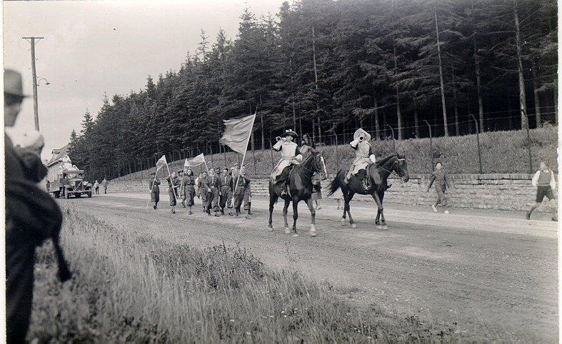 Kulturhistoriska festtåget och festspelen i Falköping den 5 augusti 1934. I täten av tåget rider två fanfarblåsande trumpetare, klädda som pager från Gustaf II Adolfs tid. Därefter följer svenska flaggan med en scoutgrupp som fanborg. Scouterna bär devisen "vörden fädrens minne".