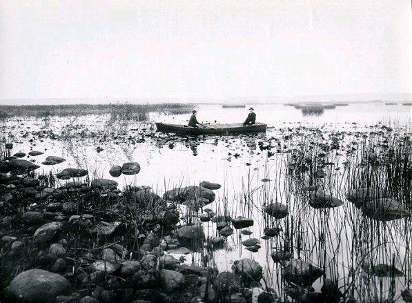 Utsikt över Hornborgasjön. Observera de runda vassarna, som då var spridda över hela sjön och utgjorde ett tillhåll för svanar och sjöfågel.