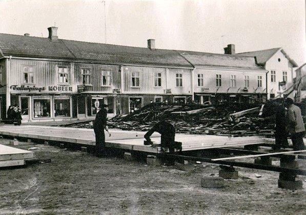 Westerstrands hus (skrädderi, Boråslagret, frisersalong och blomsterhandel). Ser ut att vara efter Veramagasinets brand 1963.