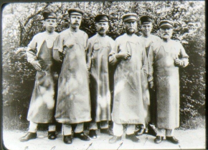 Anställda badare på Mössebergs bad. Hilmer Larsson, Karl Larsson, Badmästare 3:a fr.h. Svensson, 3:a fr.v. Moberg, Mårten Andersson, längst till höger Karlsson. (I anteckningar står det Karlsson Mehr).