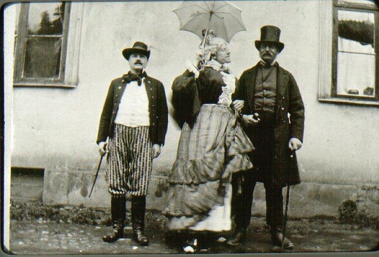 "Bröllopspar", karneval 1890-talet. Från vänster urmakare N.A.Larsson. Urmakare Moström, klädd som brud. Slöjdlärare Samuel Qvänsel, brudgum.