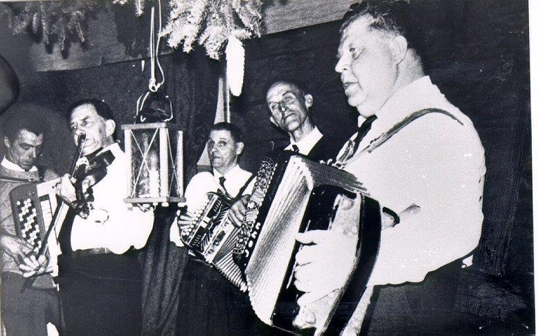 Kinneveds bygdespelmän. Programmet "Helgdagskväll vid Timmerkojan", IOGT-lokalen. Falköping 1968. Från vänster: Tage Herman Kinnarp dragspel, Axel Brenklert fiol, Gunnar Karlsson, Gustaf Antonsson och John Karlsson dragspel.