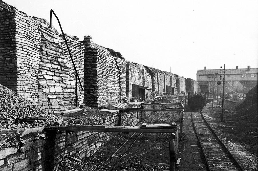 Tomtens kalkbruk, Torbjörntorp. Fältugnar med lastbryggor och järnvägsspåret.