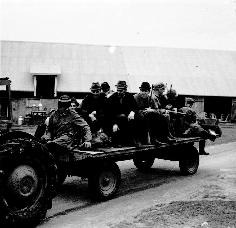 Älgjakt i Tovarpsmarkerna. Tommy Johansson, Arne Arvidsson, Rune Johansson, Karl-Erik Pettersson, Gillis Andersson, okänd, Olle Karlsson vänder ryggen till. Mellan Arne och Rune syns Björn Karlsson.