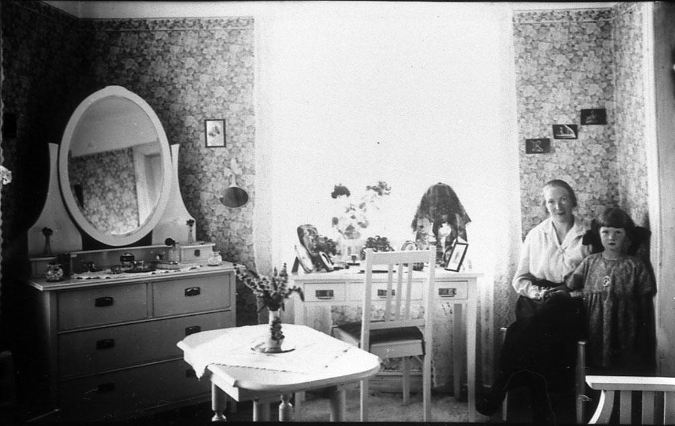 Interiör från Karl Perssons i Lugarp. Karls syster Karin var förestånderska för ålderdomshemmet i Timmele. Barnet troligen en sommarflicka.