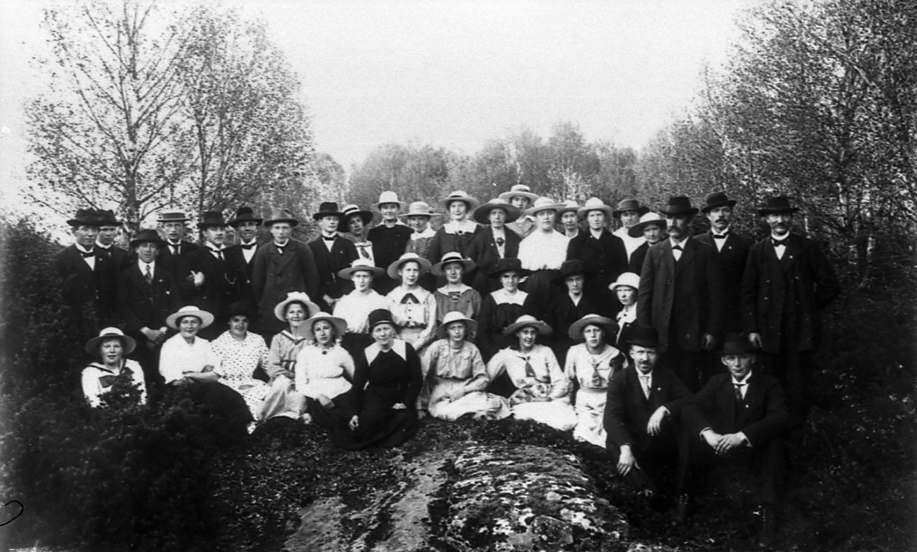 Nedersta raden: Ebba på Veken, Berta Fransson Heden, Berta Johansson Karlsgårde, Dagmar Karlsson Ängagården, okänd, Susanna på Björkelund, Elving, Rut och Isabella Chinell, Gustav på Veken, Amandus Andersson Gårestorp.