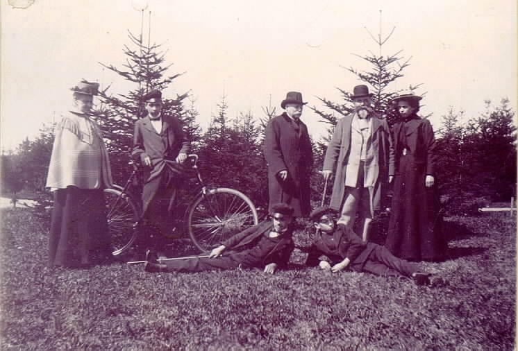 Lasarettsläkare A.P. Westerberg och överkonduktör Kronvall med familj i Planteringsförbundets park. Kronvall byggde den första villan mellan stan och Ranten, sedermera Nordstedts.