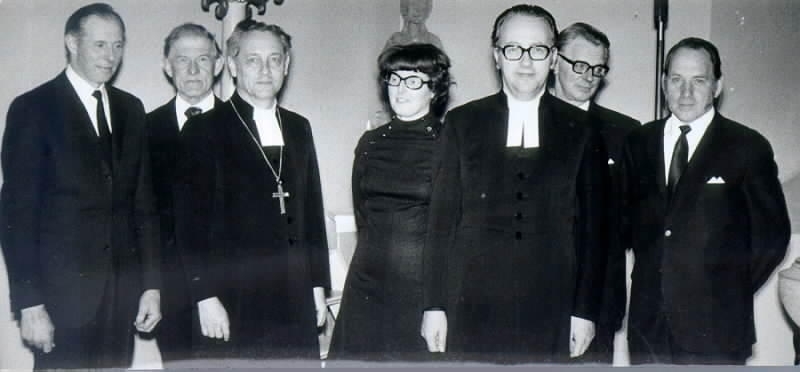 Biskopsbesök i Torbjörntorp. Från vänster: Bengt Andersson, Torvald Danielsson, Helge Brattgård, Märta Karlsson, Uno Mårtensson, Erik Karlsson, Arne Nilsson.
