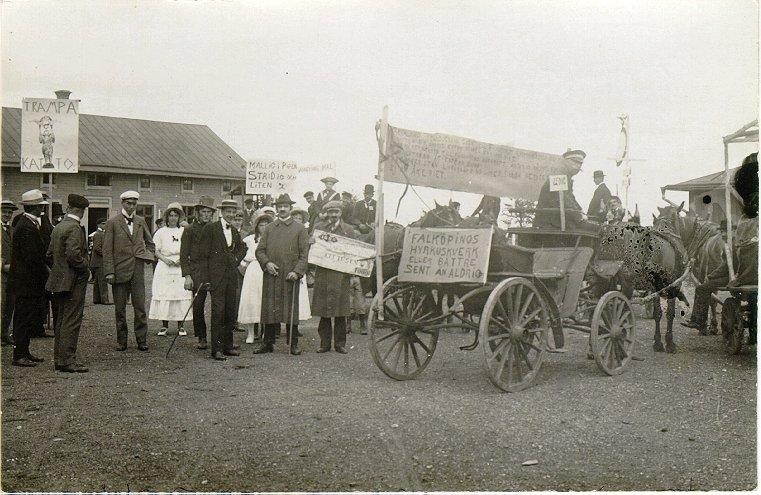 Barnens dags-karneval i Falköping lörd. den 26 & sönd. den 27 augusti 1916. Tåget samlas på folkskolans gård. Kusken är adv. Hultén.