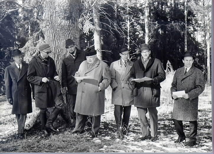 Hembygdsstyrelsen i Habo och Gustav Adolfs hembygdsförening. Fr. v. köpman Josef Lundqvist, Habo, lantmäst. Lars Weibull, Habo, kantor Bertil Söderlund, Habo, landsantikvarie Gunnar Ullenius, Skara, köpman Arne Wulff, Mullsjö, Åke Isaksson, Mullsjö, Gunnar Axelsson, Mullsjö.